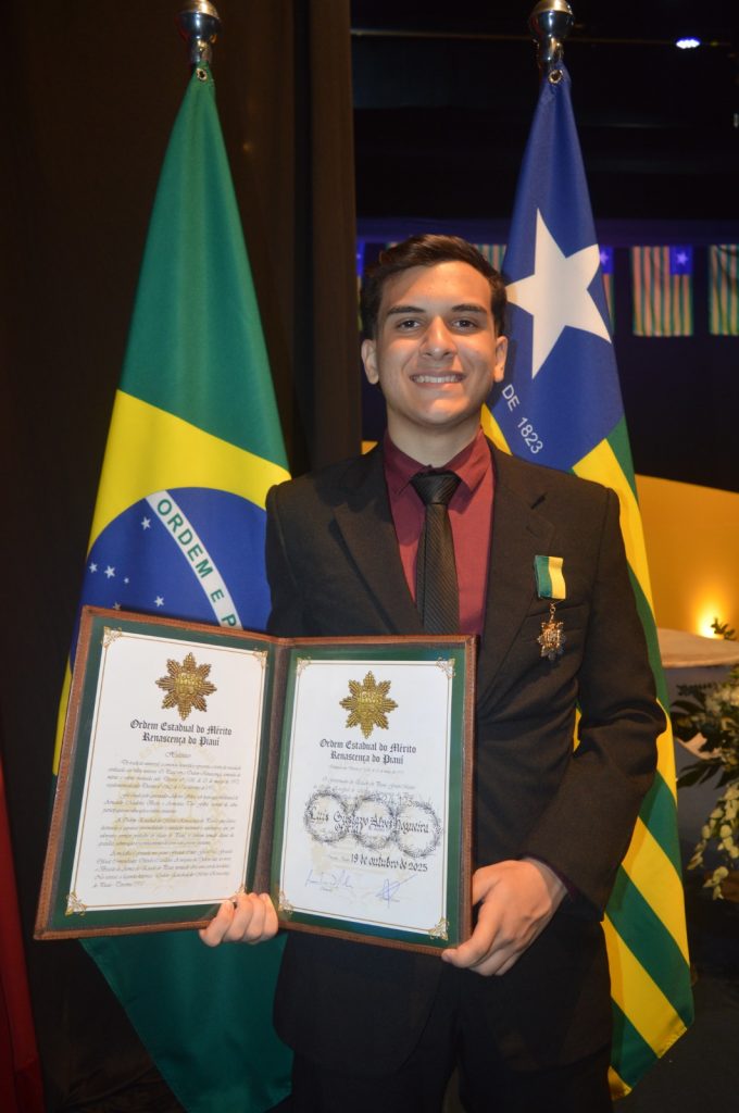 Com dedicação, disciplina e excelência, o aluno do CEV Colégio, Luís Gustavo, foi mais uma vez motivo de orgulho para os colegas. Ele recebeu das mãos do governador Rafael Fonteles a medalha da Ordem Estadual do Mérito Renascença do Piauí, uma homenagem concedida a piauienses que contribuem com o desenvolvimento do estado. O evento aconteceu no último domingo, 19 de outubro, dia do Piauí.