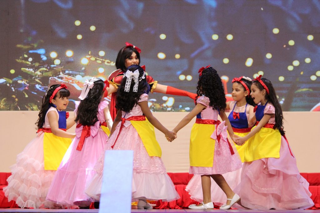 Com ajuda dos professores de Educação Física, as crianças realizaram apresentações musicais ligadas aos contos de fadas. As coreografias e a performance dos alunos emocionou os convidados, que aplaudiram de pé o desempenho dos pequenos artistas. Eles também cantaram o hino nacional, fizeram o juramento e agradeceram aos pais em português e inglês.