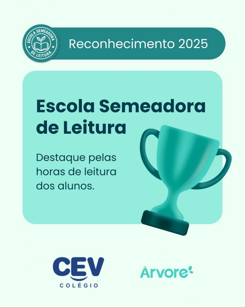 Cada vez mais apaixonados pelos livros, os alunos do CEV Colégio estão tornando-se super leitores, o que rendeu ao colégio o prêmio de “Escola Semeadora de Leitura”. Esse é um reconhecimento da Árvore, uma solução educacional parceira do CEV Colégio que vem somando com estratégias para apoiar os alunos no processo de formação de jovens leitores.