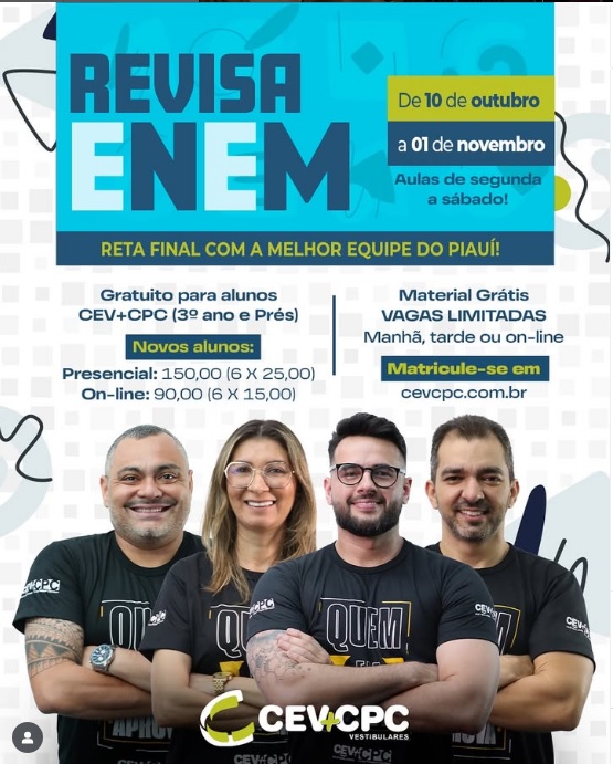 O CEV+CPC Vestibulares montou um time de peso para turbinar os estudos nessa reta final para o Exame Nacional do Ensino Médio (Enem). Com o Revisa Enem, os alunos terão aulas de revisão de conteúdo de segunda à sábado, a partir do dia 10 de outubro.