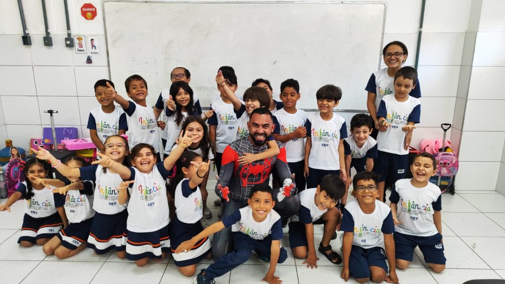 A emoção também tomou conta da escola quando o pai dos alunos Maria Vitória Borges e João Benício se fantasiou de Homem-Aranha e espalhou alegria pelos corredores da escola. Na sala de aula dos filhos, fez questão de tirar a máscara para revelar a surpresa. A turma toda aplaudiu a brincadeira e se emocionou junto a família.